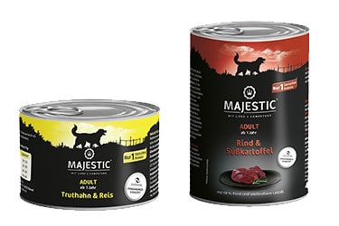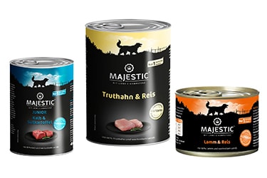Unser MAJESTIC Nassfutter erhältst du in der 200g, 400g und 800g Dose sowie in vielen leckeren Geschmacksrichtungen. MAJESTIC Nassfutter ist ein wohlschmeckende Mahlzeit, die deinen ernährungssensiblen Hund mit allen wichtigen Nähr- und Wirkstoffen versorgt. Unsere Rezeptur ist leicht verdaulich und komplett gluten- und weizenfrei.