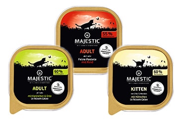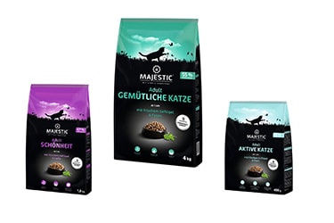 MAJESTIC Hunde- und Katzennahrung wurde in Zusammenarbeit mit Ernährungswissenschaftlern entwickelt. Es erfüllt die speziellen Bedürfnisse von Hunden und Katzen. Für jedes Alter und jedes Aktivitätsniveau gibt es das optimal abgestimmte Futter. MAJESTIC Katzennahrung zeichnet sich aus durch den Beauty-Wellness Effekt, wogegen sich das Hundefutter durch den Ballaststoff-Komplex auszeichnet. MAJESTIC bietet für Hunde und Katzen Trockenfutter, Nassfutter und Snacks.