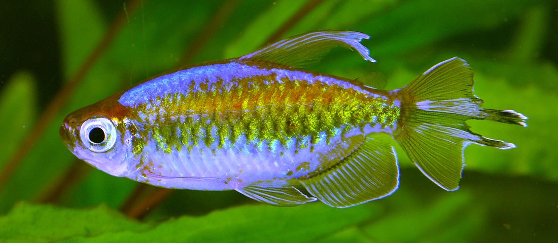 Die Kolibrisalmler sind hochrückige Tiere mit einer tief gegabelten Schwanzflosse und einem hellblauen Glanz über den ganzen Körper. Je nach Lichteinfall schimmern die Tiere auf einem fast transparent wirkenden Körper kupferfarben oder bläulich. Sowohl Männchen als auch Weibchen unter den Trochilocharax ornatus haben auf dem oberen Teil der Schwanzflosse eine rosarote und auf dem unteren Teil eine weißliche Markierung. Sehr wahrscheinlich dient diese auffällige Färbung dem Schwarmverhalten der Minifische. Du kannst die Männchen und Weibchen einfach anhand optischer Merkmale unterscheiden. So haben die Männchen im Vergleich zu den Weibchen eine verlängerte Rückenflosse und farbige Bauchflossen. Kolibrisalmler werden in der Aquaristik immer beliebter.