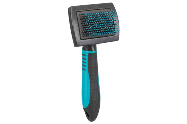 Aus Kunststoff mit extra weiche Metallborsten für eine schonende Pflege des Deckhaars und der Unterwolle. Kunststoffgriff mit rutschfester Gummieinlage.